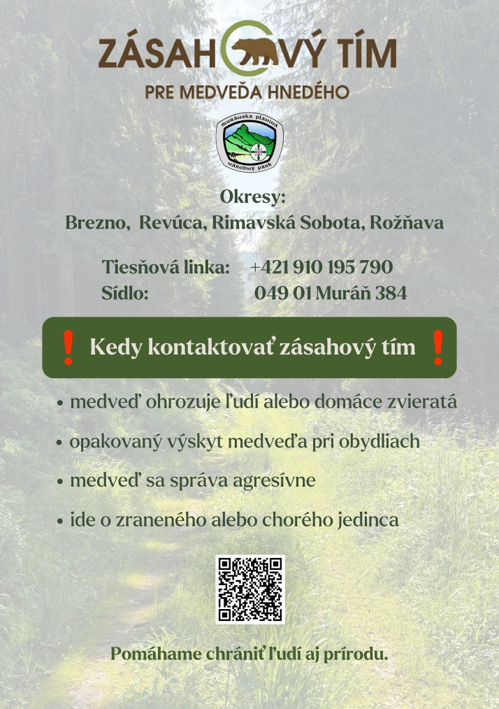 Obyvatelia sa môžu obrátiť na Zásahový tím Muráň v prípade výskytu medveďa alebo konfliktnej situácie. Naše pôsobenie zahŕňa okresy Revúca, Rožňava, Rimavská Sobota a časť okresu Brezno. Sme k dispozícii nepretržite na telefónnom čísle 0910 195 790. Mapu územia môžete nájsť pod QR – kódom na plagáte.