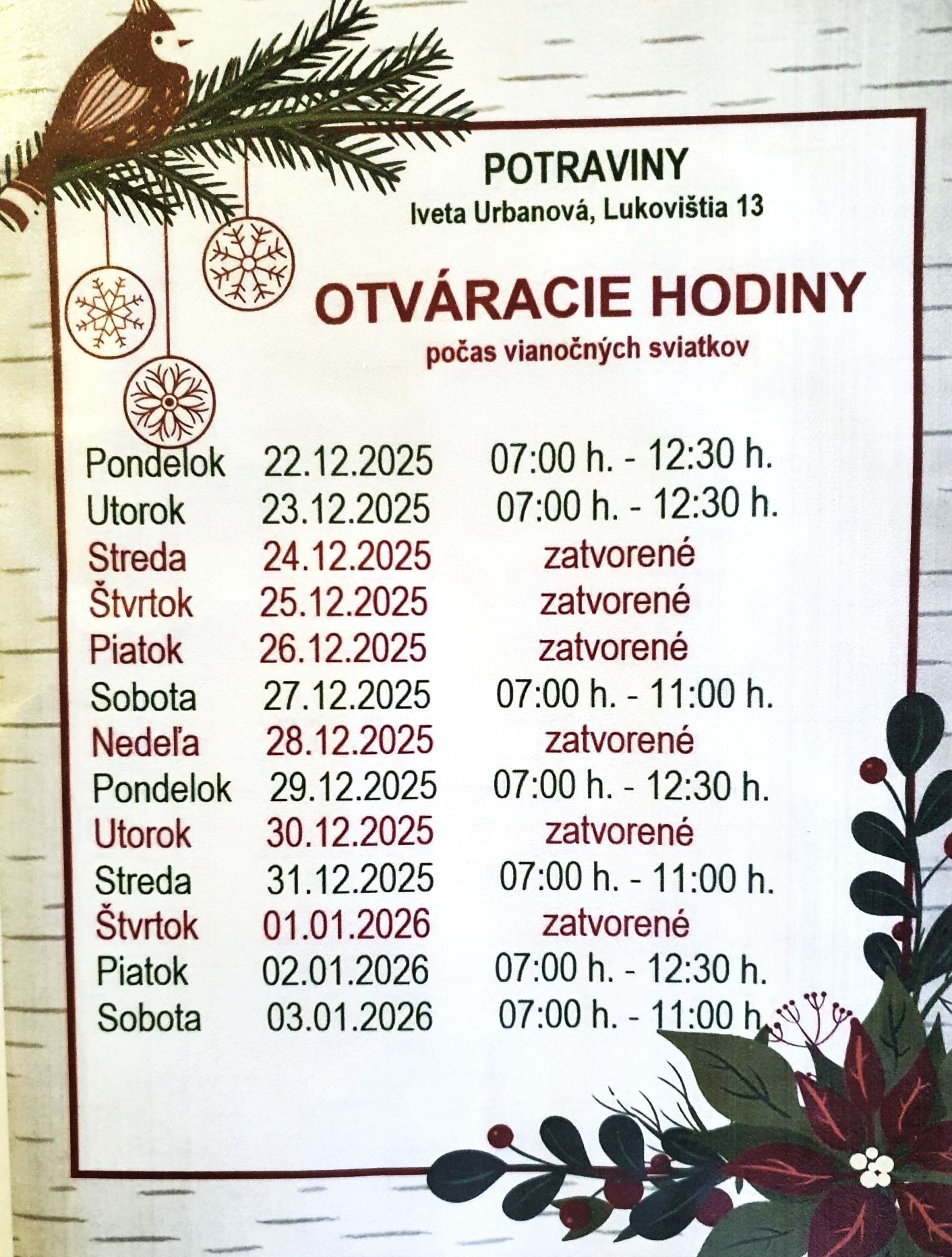 POTRAVINY Lukovištia - otváracie hodiny počas vianočných sviatkov
